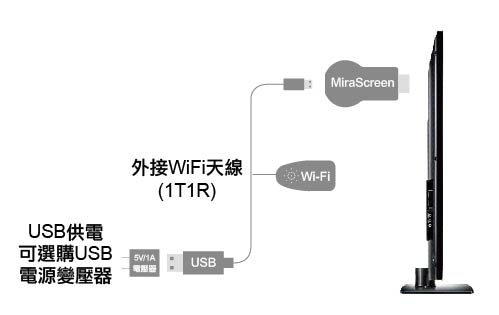 •建議自備USB電源變壓器DC 5V/1A,讓操作更穩定 (請勿插在電視後方的USB連接埠, 會有供電不足的情形)